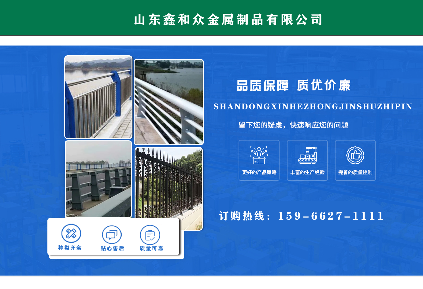 山東鑫和眾金屬制品有限公司主要產(chǎn)品有防撞護(hù)欄,橋梁護(hù)欄,道路護(hù)欄,河道護(hù)欄,不銹鋼護(hù)欄等護(hù)欄。提供設(shè)計(jì)方案,一站式定制,包您滿意價格優(yōu)惠,歡迎來電咨詢! 公司常年從事銷售護(hù)欄防撞護(hù)欄,橋梁護(hù)欄,道路護(hù)欄,河道護(hù)欄,不銹鋼護(hù)欄,橋梁鋼護(hù)欄,河道燈光護(hù)欄等。產(chǎn)品廣泛應(yīng)用于橋梁、河道、旅游景區(qū)、道路、公路、公園、小區(qū)、景觀、道路防撞等領(lǐng)域。 公司產(chǎn)品均采用優(yōu)質(zhì)不銹鋼材料,符合相關(guān)標(biāo)準(zhǔn)。各種型號不銹鋼復(fù)合管及護(hù)欄,質(zhì)量嚴(yán)格把控。產(chǎn)品強(qiáng)度高、耐腐蝕、焊接牢固、抗沖擊、性能好,防撞護(hù)欄結(jié)構(gòu)簡單、美觀實(shí)用大方。 歡迎前來訂購!...